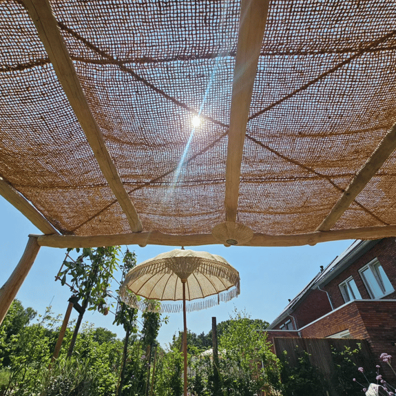 Het doek filtert zonlicht, biedt bescherming tegen UV‑straling en zorgt ervoor dat je buitenruimte ook op warme dagen comfortabel blijft.